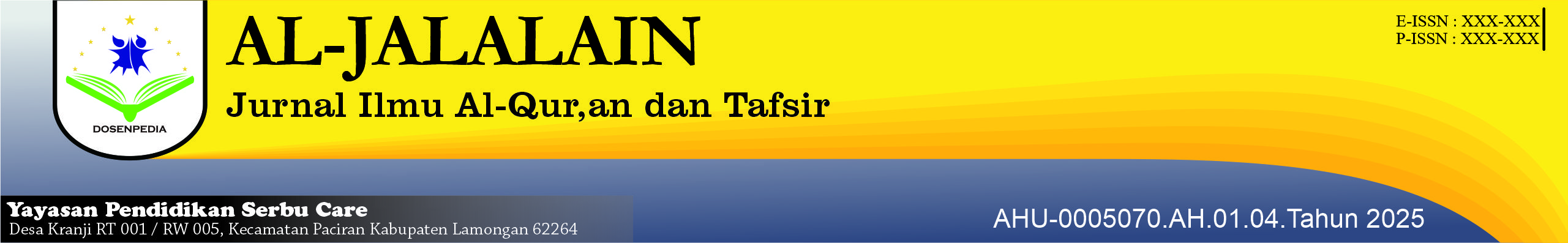 Al-JALALAIN: Jurnal Studi Al-Qur’an dan Tafsir is a peer-reviewed academic journal published twice a year (July and December), focusing on scholarly studies of the Qur’an from various perspectives. Its scope includes exegesis and methodology, studies on exegetical figures and traditions, thematic interpretations related to contemporary issues, interdisciplinary integration, manuscript studies, spirituality and mental health, law and ethics, phenomenology, and the development of digital exegesis. Managed by the Department of Qur’anic Studies, Rumah Jurnal Dosenpedia Yayasan Pendidikan Serbu Care Lamongan, this journal is committed to enriching the understanding of the Qur’an in ways that remain relevant to the dynamics of modern developments.